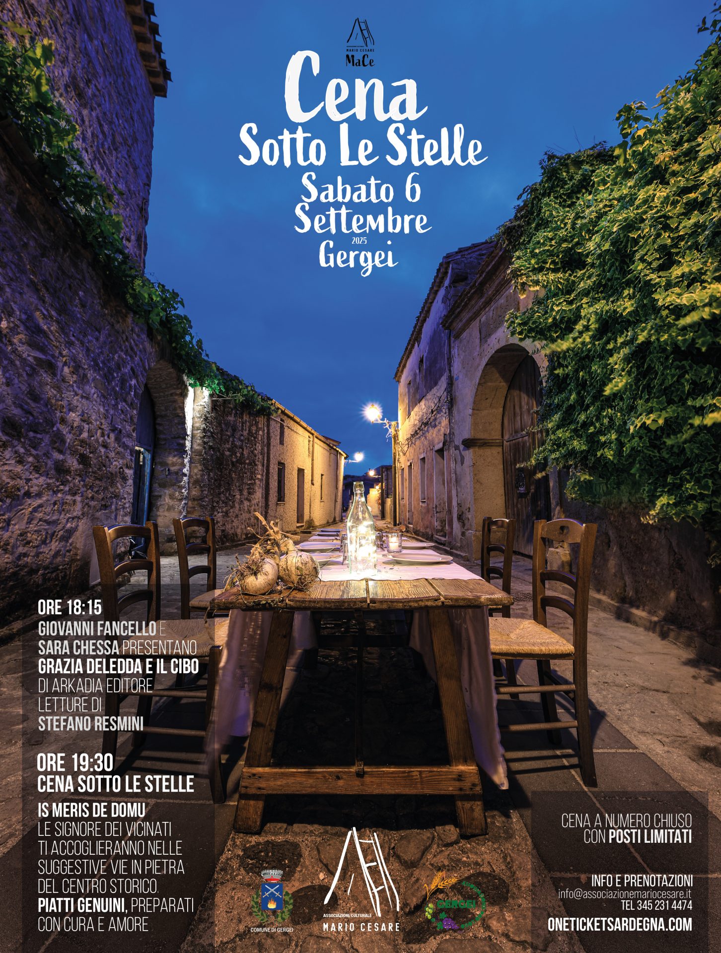 Gergei Sabato 6 Settembre 2025 _ Cena Sotto le Stelle e Serata Letteraria Nelle suggestive vie del centro storico di Gergei preparata dalle sapienti mani delle signore del paese. Sabato 6 Settembre Gergei si trasforma in un luogo magico, dove l'arte, la tradizione e la convivialità si fondono in un'unica esperienza indimenticabile. Alle ore 18:15 presentazione del libro - Grazia Deledda e il Cibo - Giovanni Fancello e letture di Stefano Resmini Alle Ore 19:30 Cena Sotto le Stelle Prezzo cena 45€ compresi diritti di prevendita Qui ti aspetta la bontà del Sarcidano a tavola con una cena dai sapori autentici. Menù della Serata: PRIMO Macaronis de ciliriu (di pasta lievitata) cun bagna de Tamata frisca SECONDO Bombas cun bagna CONTORNI Mazamurru Simbula fritta Croccoriga prena Pisci a colletu Perdingianu a schiscionera Benvenuto a MaCè 2025! Inoltre le signore dei vicinati di Gergei ti accoglieranno in un'atmosfera autentica e coinvolgente tra le vie del centro storico imbandite con tovaglie, arredi e stoviglie... proprio come a casa loro! L'evento è organizzato dall'Associazione Mario Cesare, signore dei vicinati e la Pro Loco di Gergei.